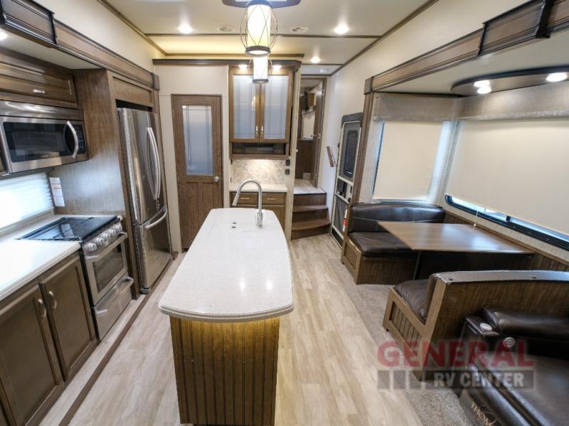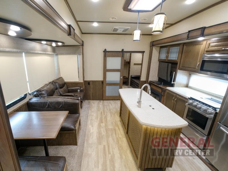 The Solitude S-Class 3740BH-R is engineered to accommodate up to eight people comfortably, ensuring that everyone can enjoy a restful night's sleep. The thoughtfully designed interior features a master suite, a bunkhouse, and convertible sleeping areas, catering to diverse sleeping arrangements. The elegant finishes and high-quality materials throughout the RV create a welcoming and sophisticated atmosphere, perfect for both short getaways and extended stays.
