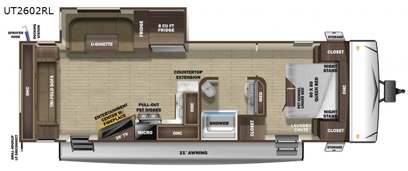 The Open Range Ultra Lite UT2602RL features a single slide-out that expands your living space, providing a roomy and inviting interior. This travel trailer comfortably sleeps up to five people, making it perfect for family getaways or trips with friends. The intelligently designed floor plan includes a cozy sleeping area, a fully equipped kitchen, and a welcoming living space, ensuring that every journey is as enjoyable as the destination. The high-quality finishes and thoughtful details throughout the RV create a warm and inviting atmosphere.