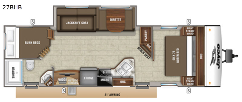 Designed to accommodate up to eight people, the Jay Feather 27BHB ensures that everyone has a cozy place to rest. The intelligently designed floor plan includes a queen-sized bed, double bunk beds, and convertible dinette and sofa beds, offering versatile sleeping arrangements for families or groups of friends. The modern kitchen is equipped with all the essentials, including a refrigerator, microwave, and stovetop, making meal preparation a breeze. The stylish interior, complete with durable finishes and thoughtful storage solutions, ensures that you travel in comfort and style.