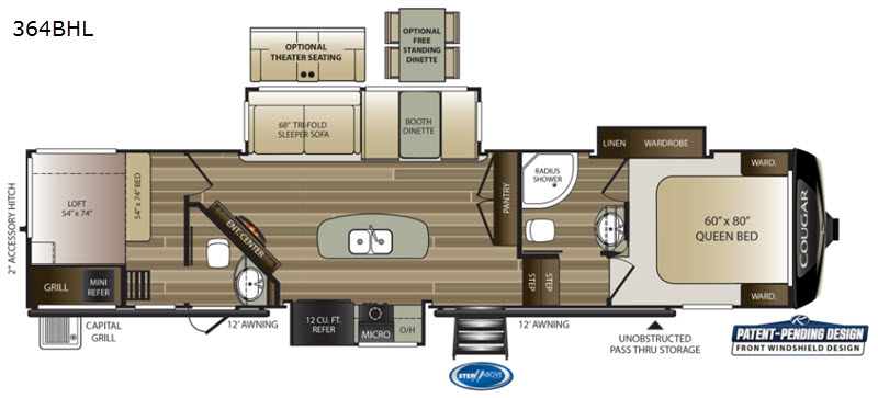 The Cougar 364BHL is a haven for families or groups, comfortably sleeping up to nine people. Whether you're embarking on a weekend getaway or an extended road trip, everyone will find their own cozy corner. The intelligently designed floor plan includes a master suite, a bunkhouse, and convertible sleeping areas, ensuring everyone has a restful night's sleep. With a weight of around 5,120 kilograms, this fifth wheel is robust yet easy to tow, making it an ideal choice for both seasoned RV enthusiasts and newcomers alike.