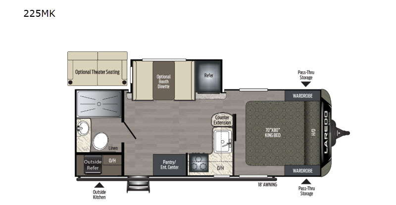The Laredo 225MK features one slide-out, which significantly expands the interior space, creating a welcoming environment for relaxation and leisure. Designed to sleep two, it is ideal for couples or solo adventurers seeking a cozy retreat on the road. The interior is thoughtfully laid out, with a focus on maximizing space and comfort. High-quality materials and finishes are evident throughout, from the plush seating to the well-appointed kitchen, which includes modern appliances and ample storage.