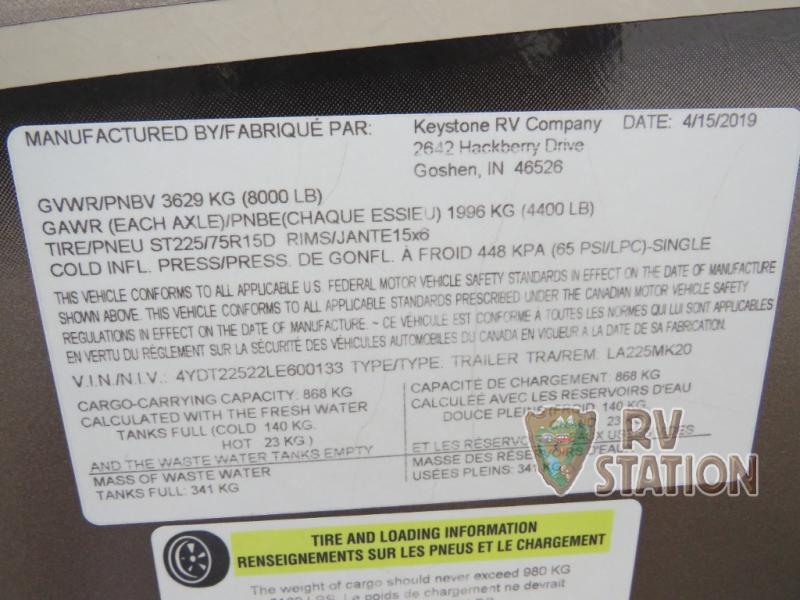Introducing the 2020 Keystone RV Laredo 225MK Travel Trailer, a meticulously crafted mobile haven designed for the discerning traveler. This travel trailer is the epitome of comfort and functionality, offering a perfect blend of modern amenities and robust construction. With a length of 22 feet, it is compact enough for easy maneuverability yet spacious enough to provide a comfortable living space. Weighing approximately 2,630 kilograms, this trailer is engineered for stability and ease of towing, ensuring a smooth journey to your destination.