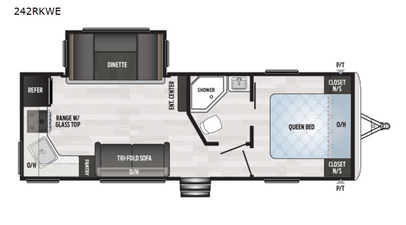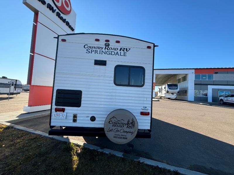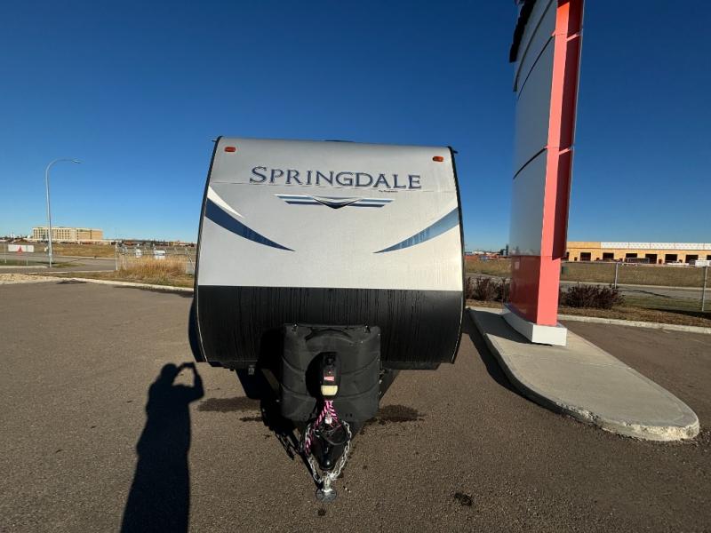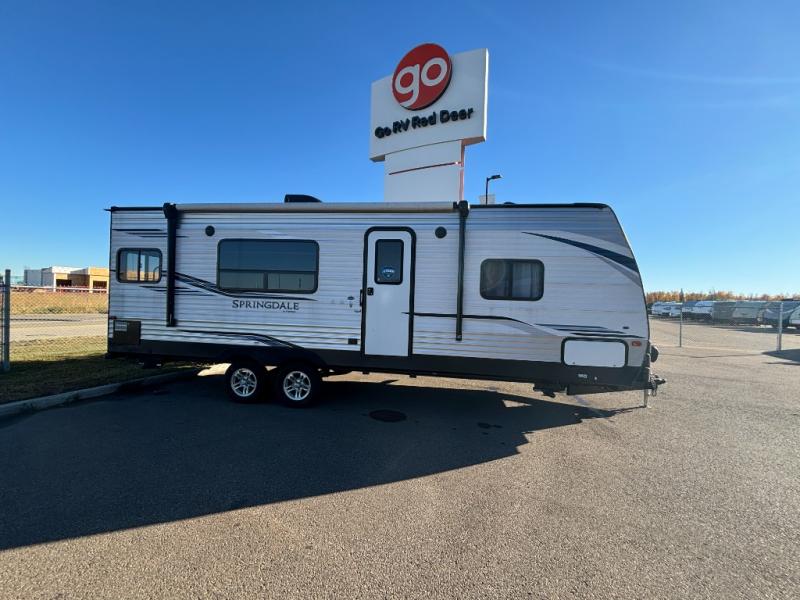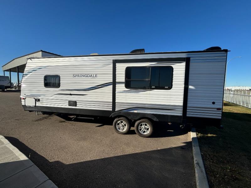 Measuring approximately 23 feet in length, the Springdale 242RKWE provides ample room without compromising on maneuverability. Its thoughtful layout includes a well-appointed rear kitchen, complete with modern appliances and plenty of storage, making meal preparation a breeze. The living area is designed for relaxation, featuring a cozy dinette and a comfortable sofa, both of which can be converted into sleeping spaces. The master bedroom offers a private retreat with a plush queen-sized bed, ensuring a restful night's sleep after a day of exploration.