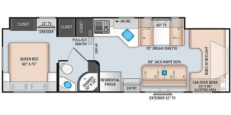 Inside, you'll find all the comforts of home, including a fully-equipped kitchen with a refrigerator, microwave, and stove, making meal prep a breeze. The living area is designed for relaxation, featuring a comfy dinette and a sofa where you can kick back and enjoy a movie night on the flat-screen TV. The sleeping arrangements are versatile, with a queen-size bed in the rear, a cab-over bunk, and convertible sleeping spaces in the living area, ensuring everyone has a cozy spot to rest.