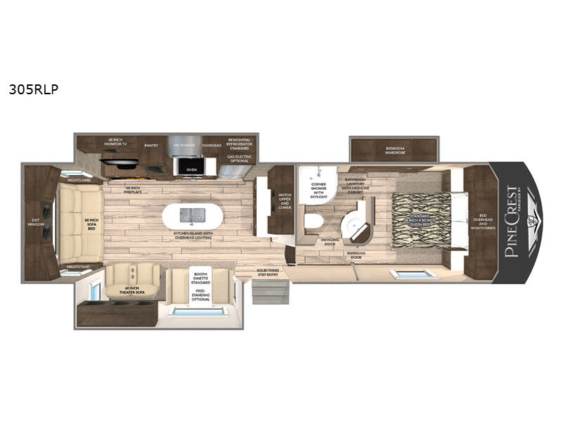 Measuring approximately 27 feet in length, the Pinecrest 305RLP is thoughtfully designed to maximize both functionality and aesthetics. The interior is tastefully appointed, featuring high-quality finishes and modern amenities that cater to your every need. This RV comfortably accommodates up to five people, making it ideal for family adventures or trips with friends. The sleeping arrangements are versatile and comfortable, ensuring a restful night's sleep after a day of exploration.