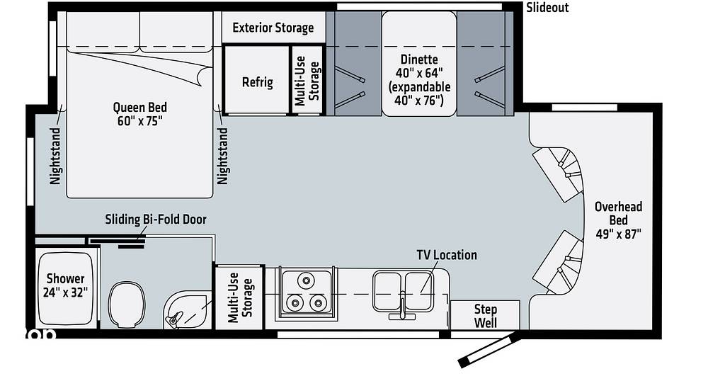 Measuring 20 feet in length, the Vita 24P offers a compact yet efficient layout that maximizes space and functionality. Inside, you'll find a well-appointed living area with a fully-equipped kitchen, including a refrigerator, microwave, and stove, making meal prep a breeze. The dinette easily converts into a sleeping area, while the overhead cab bunk and rear bed provide additional sleeping options. The bathroom features a shower, sink, and toilet, ensuring all the conveniences of home are at your fingertips.