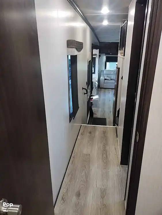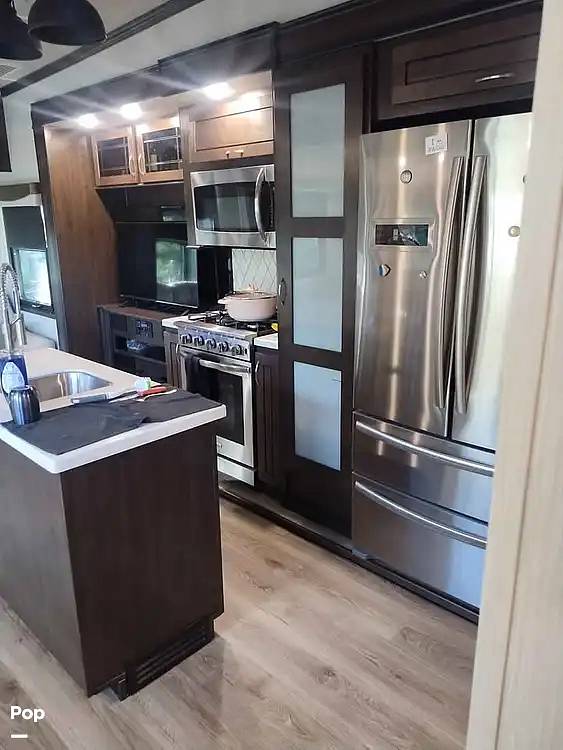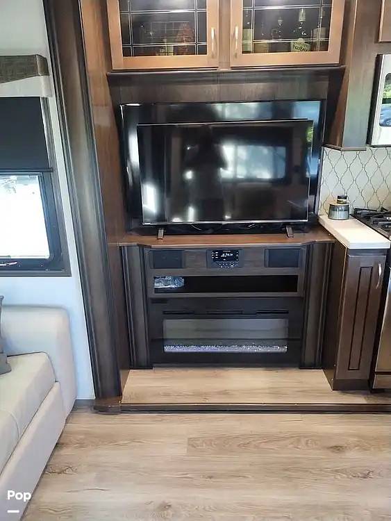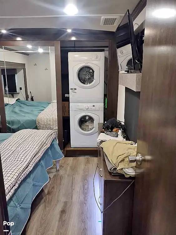 At 31 feet long, this Fifth Wheel offers plenty of space to stretch out and relax. Inside, you'll find a well-designed layout that includes a separate bunkhouse, perfect for the kids or guests. The living area is spacious and inviting, with plush seating and a large entertainment center for those cozy movie nights. The kitchen is fully equipped with modern appliances, making it easy to whip up your favorite meals on the road. Plus, there's ample storage throughout, so you can bring along all your essentials without feeling cramped.