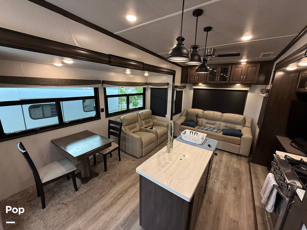 At 31 feet long, this Fifth Wheel offers plenty of space to stretch out and relax. Inside, you'll find a well-designed layout that includes a separate bunkhouse, perfect for the kids or guests. The living area is spacious and inviting, with plush seating and a large entertainment center for those cozy movie nights. The kitchen is fully equipped with modern appliances, making it easy to whip up your favorite meals on the road. Plus, there's ample storage throughout, so you can bring along all your essentials without feeling cramped.