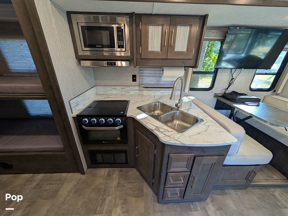 Inside, you'll find a thoughtfully designed living space that includes a fully equipped kitchen, complete with modern appliances and ample storage. The sleeping arrangements are versatile, featuring a master bedroom with a cozy queen bed, convertible dinette and sofa beds, and a set of bunk beds, ensuring everyone has a comfortable place to rest. The bathroom is well-appointed with a shower, sink, and toilet, providing all the comforts of home on the road.