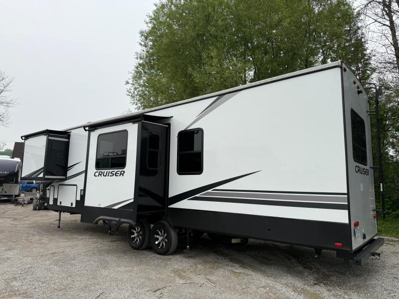 Outside, the Cruiser 3601GK continues to impress with its durable construction and thoughtful design. The large awning provides shade on sunny days, and the ample storage compartments make it easy to bring along all your gear. With its sleek exterior and reliable performance, this RV is not just a vehicle; it's a home on wheels. Don't miss the chance to own this exceptional fifth wheel and start creating unforgettable memories on the road today!