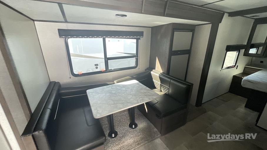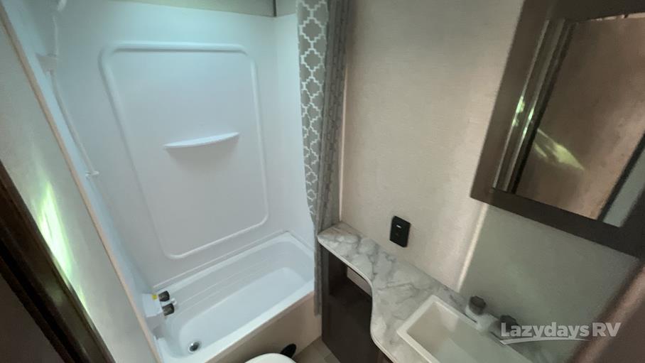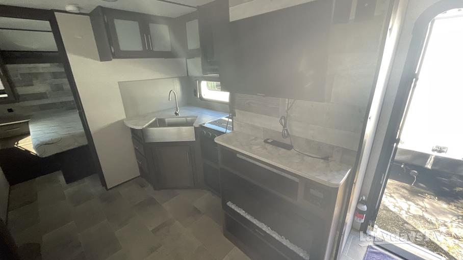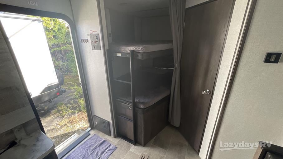 Step inside to discover a thoughtfully designed interior featuring a spacious living area with a convertible sofa and a dinette, providing plenty of seating for relaxation or dining. The kitchen is equipped with high-quality appliances, including a refrigerator, microwave, and three-burner stove, all set within a stylish cabinetry layout. The master bedroom offers a cozy queen-sized bed, while the bunkhouse provides additional sleeping space, making it ideal for accommodating guests or children. The bathroom is well-appointed with a shower, sink, and toilet, ensuring all the comforts of home are at your fingertips.