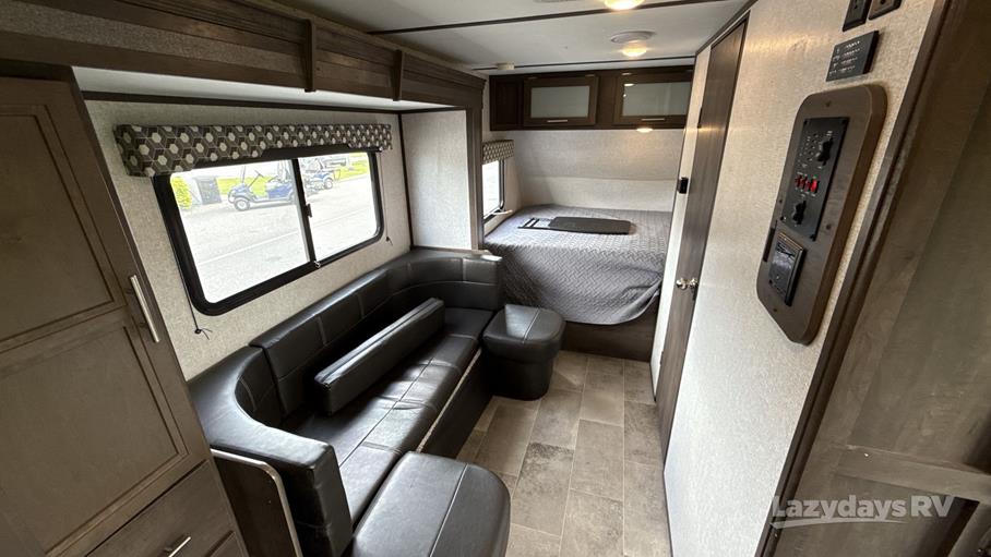 Step inside to find a well-thought-out interior featuring a single slide-out that expands your living space, providing ample room for relaxation and entertainment. The cozy sleeping area comfortably accommodates two, ensuring a restful night's sleep after a day of exploration. The kitchen is equipped with essential appliances, including a refrigerator, microwave, and two-burner stove, all designed to make meal preparation a breeze. The dinette area offers a comfortable spot for dining or planning your next adventure.
