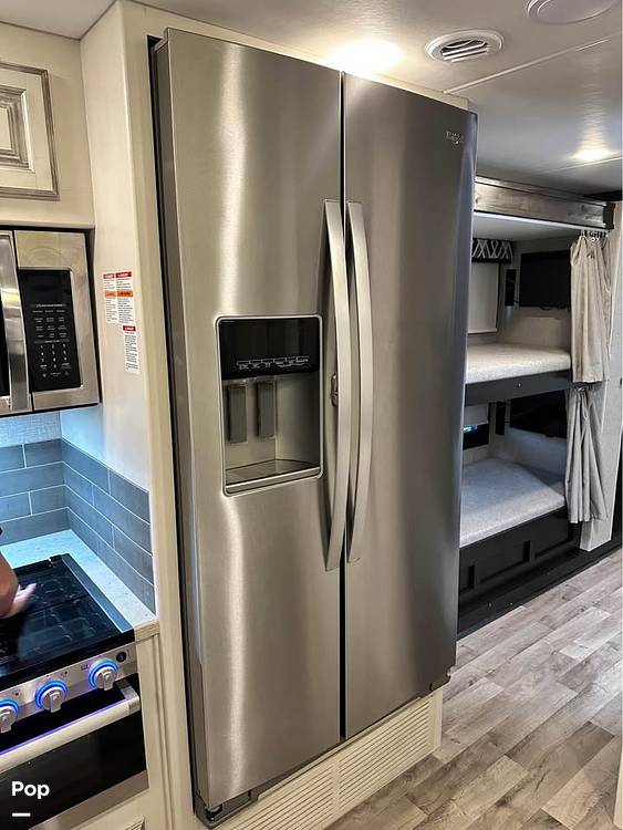 Inside, you'll find a well-thought-out layout that maximizes space and comfort. The Vision 36A features a fully equipped kitchen, complete with a refrigerator, microwave, and stove, making it easy to whip up your favorite meals on the go. The cozy living area is perfect for relaxing after a day of exploring, with plush seating and a flat-screen TV for entertainment. The sleeping arrangements are versatile, with a master bedroom, bunk beds, and convertible sofa beds, ensuring everyone has a comfy spot to rest.