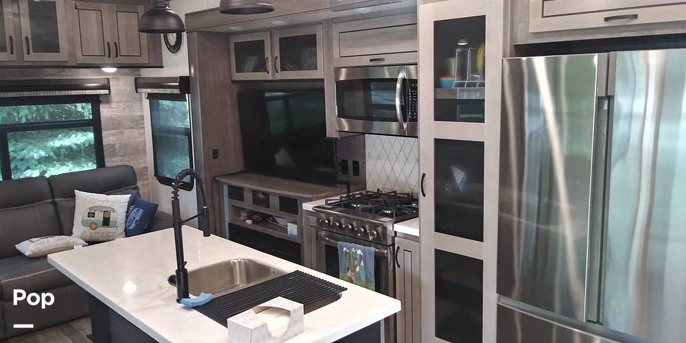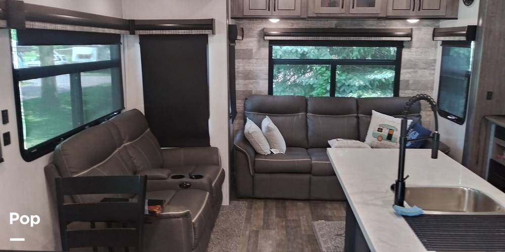 The Cedar Creek 377BH also features a separate bunkhouse, providing a private space for kids or guests, and a luxurious master suite with a comfortable bed and plenty of closet space. The bathroom is spacious and well-appointed, ensuring you have all the comforts of home wherever you roam. Whether you're planning a weekend getaway or a cross-country adventure, this RV has everything you need to travel in style and comfort. Don't miss out on making unforgettable memories with this fantastic fifth wheel!