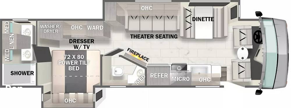Inside, you'll find a thoughtfully designed living space that comfortably sleeps up to six people. Whether you're traveling with family or friends, everyone will enjoy the cozy sleeping arrangements and the inviting atmosphere. The well-equipped kitchen features modern appliances, allowing you to prepare delicious meals on the go. Relax in the comfortable seating area, where you can unwind after a day of exploration or enjoy a movie night with the built-in entertainment system.