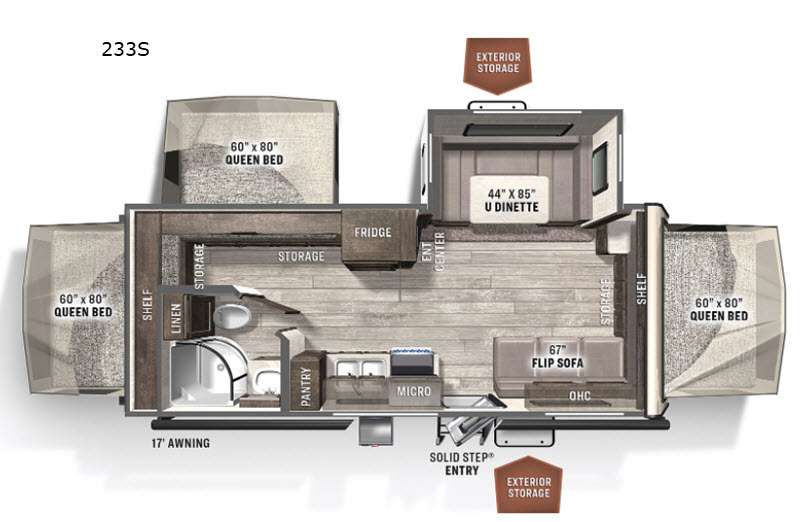 The Rockwood Roo 233S is equipped with one slide-out, which significantly expands the interior living area, ensuring a comfortable and inviting atmosphere. This model is thoughtfully designed to accommodate up to nine people, making it an ideal choice for larger families or groups seeking a memorable camping experience. The intelligently designed floor plan maximizes space and functionality, featuring a well-appointed kitchen, a cozy dining area, and multiple sleeping arrangements to suit your needs.