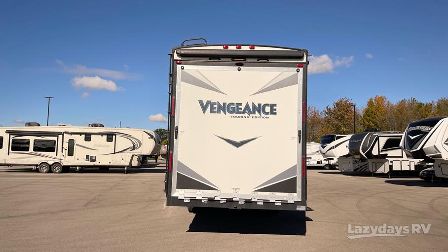 Step inside and experience the expansive living space, enhanced by three expertly designed slide-outs that maximize every inch of this RV. The Vengeance 383G2 boasts a modern and stylish interior, featuring high-quality finishes and thoughtful amenities. The fully-equipped kitchen is a chef's dream, complete with top-of-the-line appliances and generous counter space, ensuring that meal preparation is a breeze. The cozy living area invites relaxation, with plush seating and a state-of-the-art entertainment system, perfect for unwinding after a day of exploration.