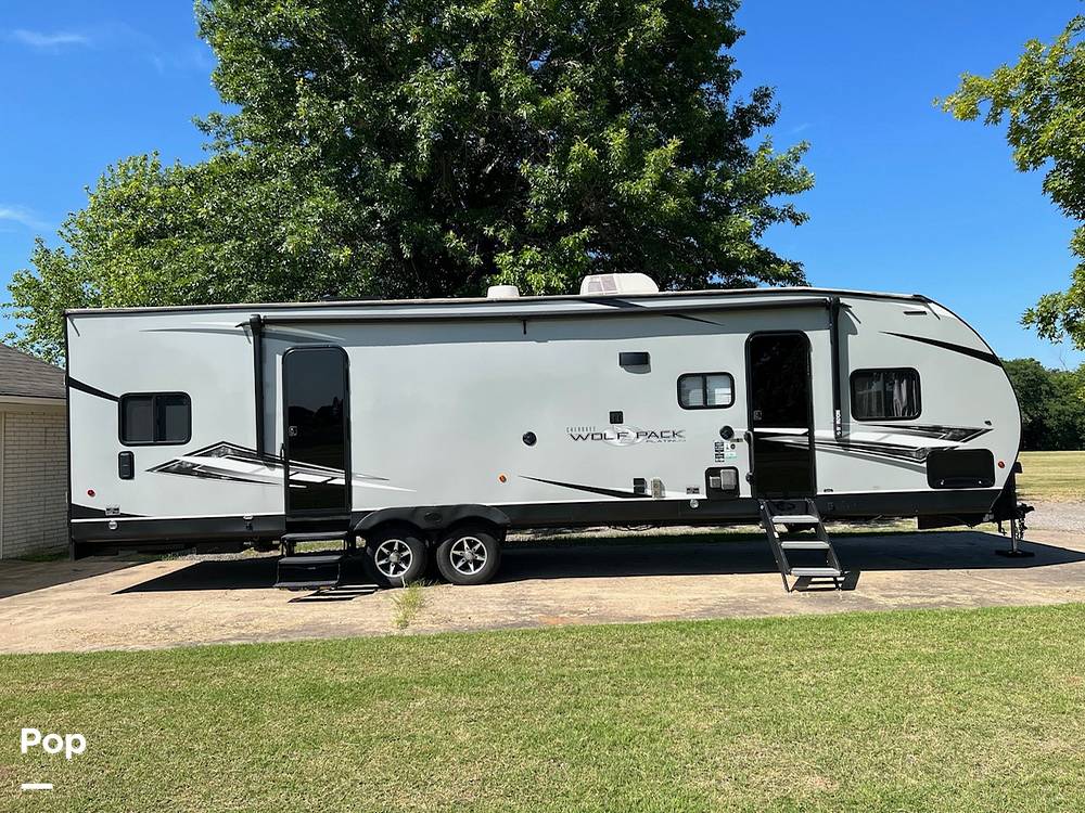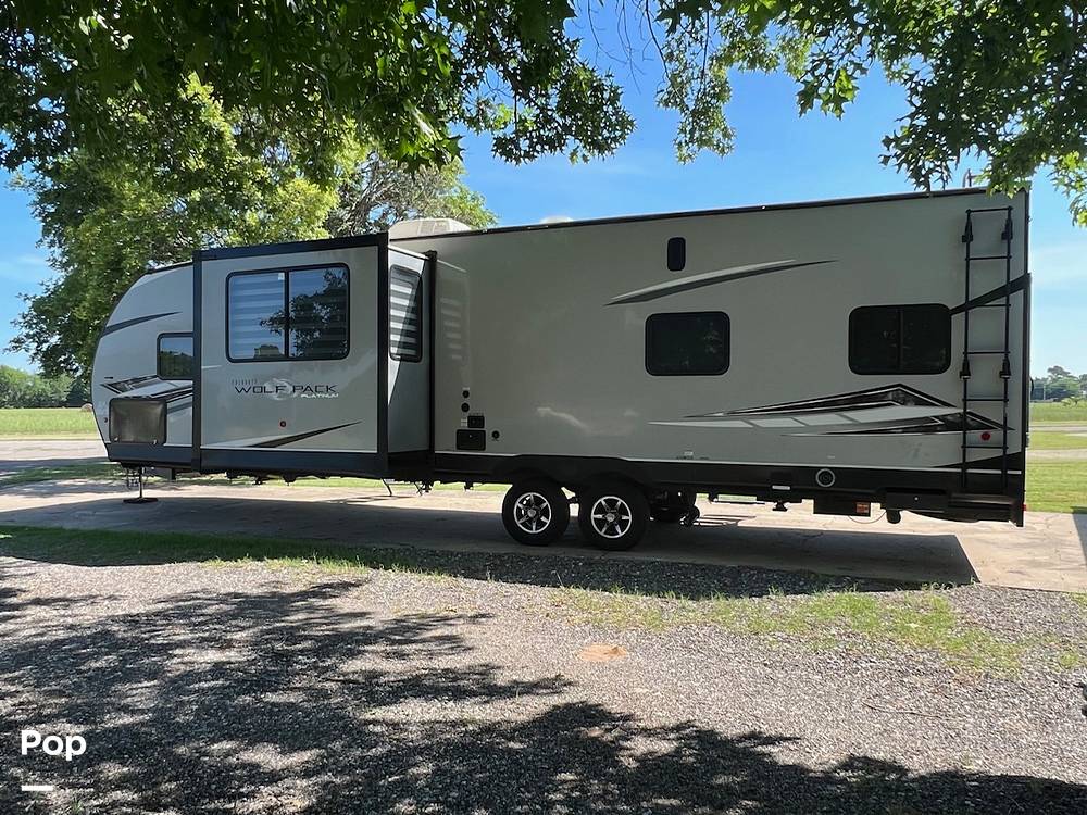 Measuring an impressive 31 feet in length, the Wolf Pack 25PACK12+ boasts a thoughtfully designed layout that maximizes space and convenience. Inside, you'll find a well-equipped kitchen with modern appliances, a cozy living area for relaxation, and ample storage to keep all your essentials organized. The sleeping arrangements include a master bedroom, convertible sofas, and bunk beds, ensuring everyone has a comfortable place to rest after a day of exploration.