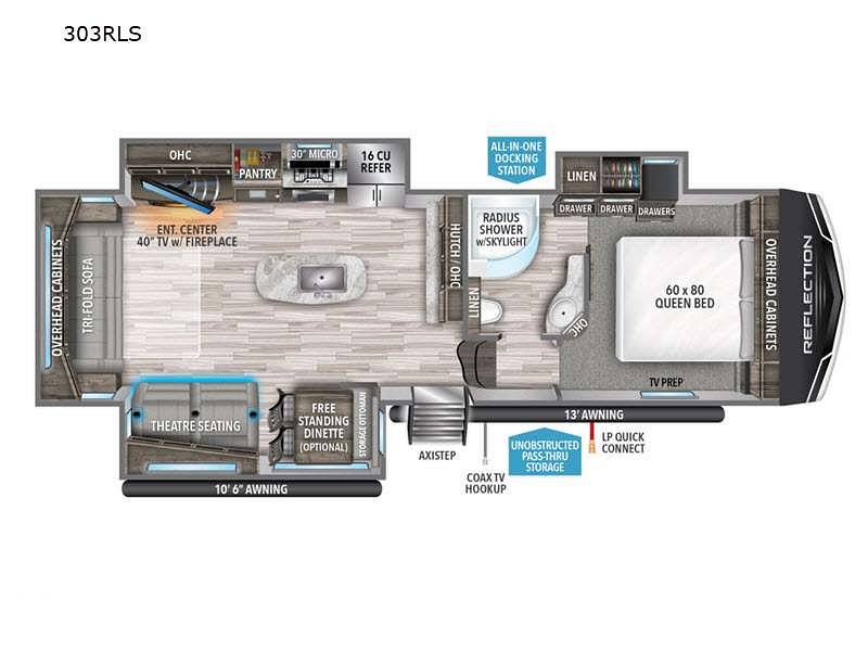 Inside, the Reflection 303RLS comfortably sleeps up to six people, making it ideal for family vacations or trips with friends. The well-appointed living area features plush seating and a cozy atmosphere, perfect for relaxing after a day of adventure. The kitchen is equipped with high-quality appliances and ample storage, allowing you to prepare meals with ease. The dining area provides a comfortable space for enjoying meals together, fostering a sense of home even while on the road.