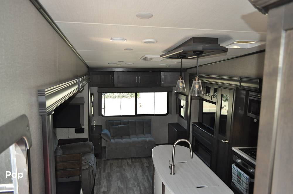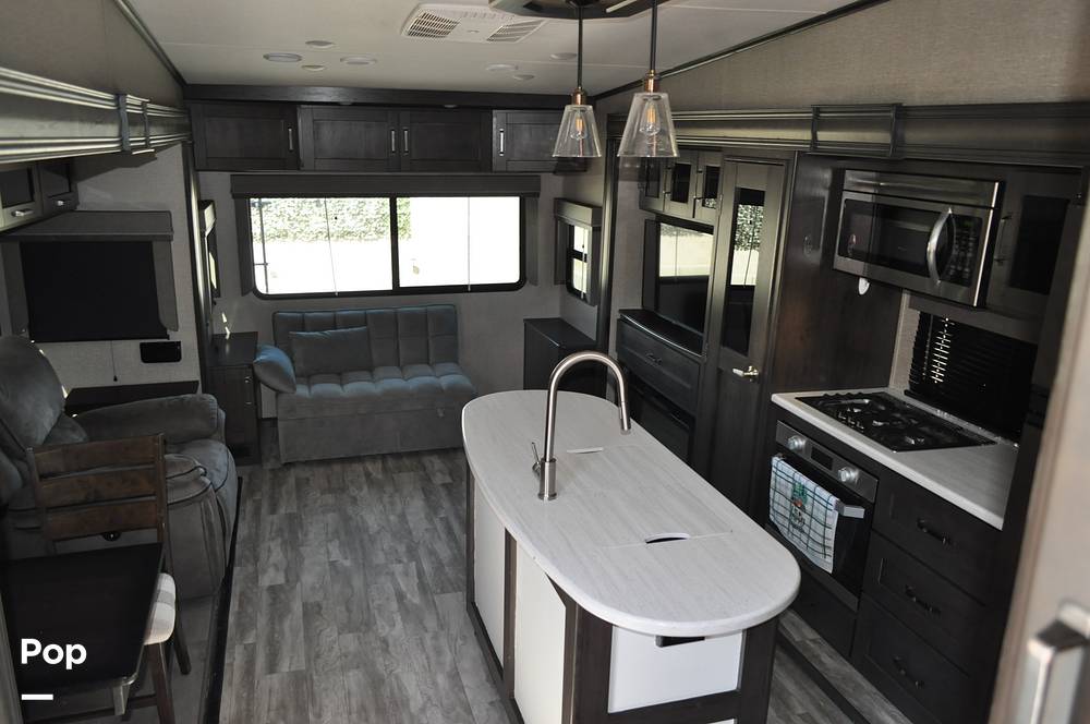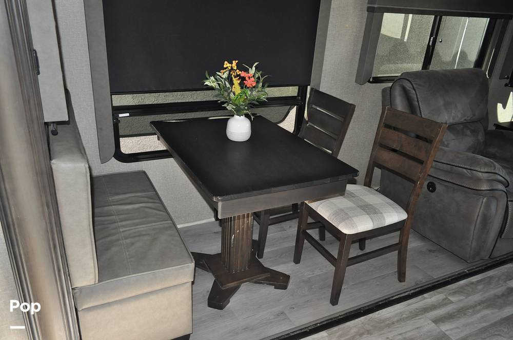 Inside, the Grand Design Reflection 337RLS comfortably accommodates up to four guests, making it perfect for families or couples. The thoughtfully designed interior features a spacious living area, complete with plush seating and a state-of-the-art entertainment system. The fully equipped kitchen boasts modern appliances, including a refrigerator, stove, and microwave, allowing you to prepare gourmet meals with ease. The elegant dining area provides a cozy setting for enjoying your culinary creations. The master bedroom offers a serene retreat, featuring a queen-sized bed and abundant storage space, while the convertible sofa in the living area provides additional sleeping accommodations.