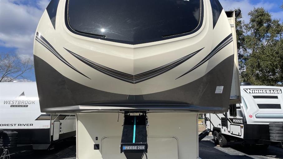 This fifth wheel is a true masterpiece of design and functionality. It comfortably sleeps up to six people, making it ideal for family trips or getaways with friends. The cleverly designed interior includes a cozy living room, a fully-equipped kitchen, and a luxurious bedroom, all crafted with high-quality materials and finishes. The kitchen is a chef's dream, featuring modern appliances and ample counter space, perfect for preparing delicious meals on the road.