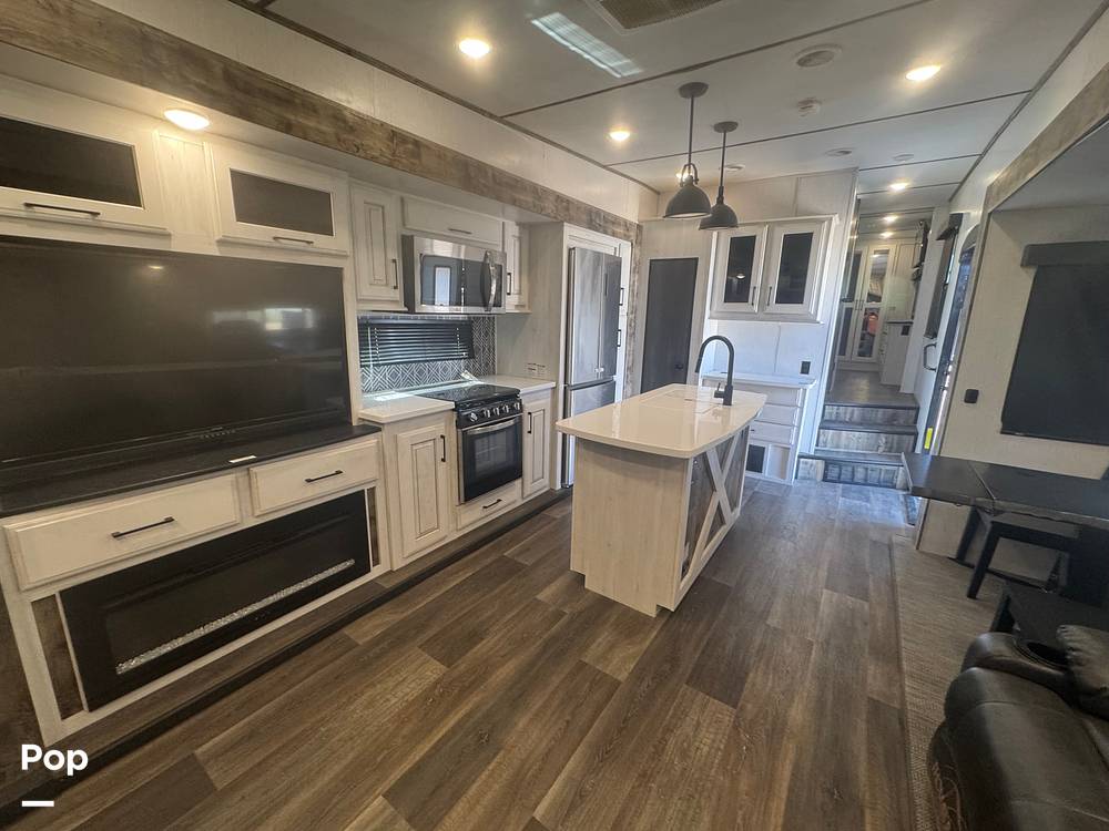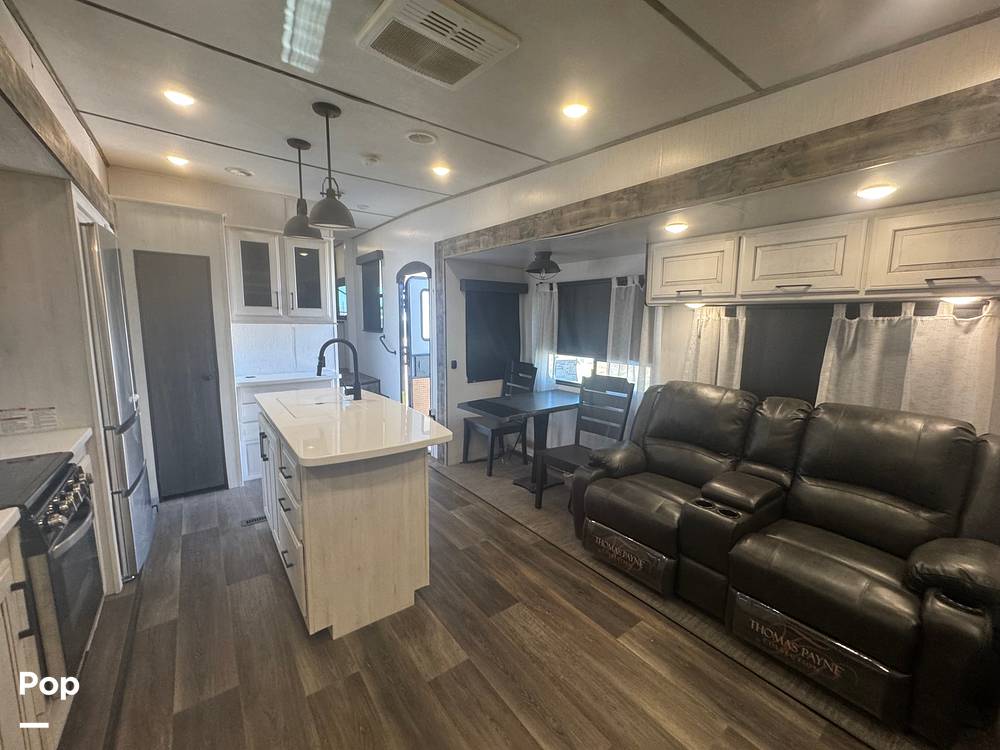 Measuring approximately 27 feet in length, this fifth wheel offers ample living space while remaining easy to tow and maneuver. Inside, you'll find a well-appointed kitchen equipped with modern appliances, making meal preparation a breeze. The inviting living area features plush seating and a large entertainment center, perfect for relaxing after a day of exploration. The master bedroom offers a comfortable queen-sized bed, while additional sleeping accommodations are available in the convertible sofa.