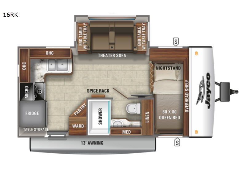 The Jay Feather 16RK boasts a smart and efficient layout, featuring one slide-out that expands your living space, providing ample room to relax and unwind. Designed to comfortably sleep two, this travel trailer is perfect for couples or solo adventurers seeking a cozy retreat. Inside, you'll find a well-appointed kitchen with modern appliances, allowing you to prepare meals with ease. The thoughtfully designed interior maximizes space and functionality, ensuring you have everything you need for a comfortable stay.