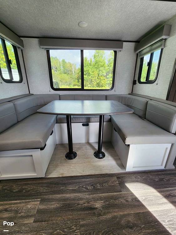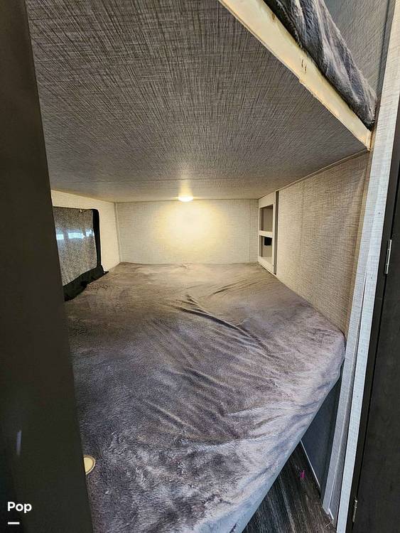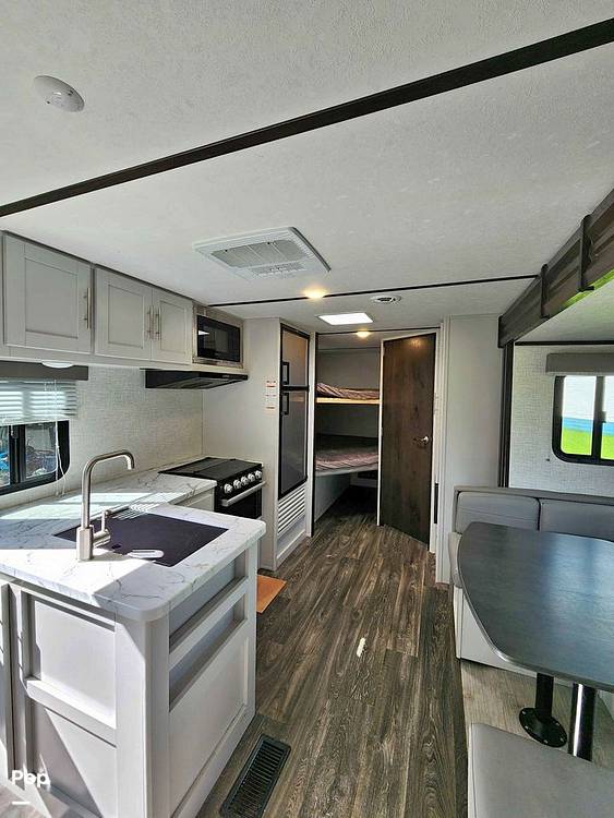 Measuring approximately 24 feet in length, the Keystone Bullet Crossfire is compact enough for easy towing yet spacious enough to accommodate all your needs. Inside, you'll find a thoughtfully laid-out interior featuring a cozy sleeping area, a fully equipped kitchen, and a functional bathroom. The kitchen comes with essential appliances, allowing you to prepare meals with ease, while the dinette area provides a welcoming space for family gatherings. The bunk beds are perfect for kids or guests, ensuring everyone has their own comfortable sleeping space.