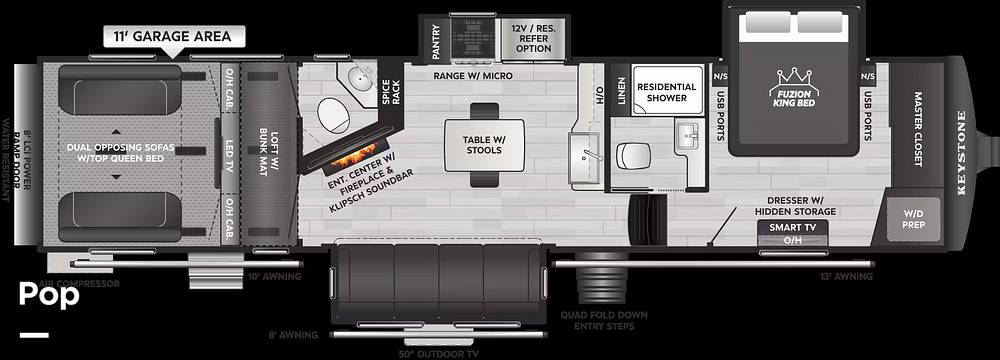 Introducing the 2021 Keystone Fuzion 373 Fifth Wheel, a premium RV designed for those who seek adventure without compromising on comfort. This meticulously crafted vehicle offers a spacious and luxurious living experience, perfect for families or groups of up to seven people. With a length of 33 feet, the Fuzion 373 provides ample space for relaxation and entertainment, ensuring that every journey is as enjoyable as the destination.