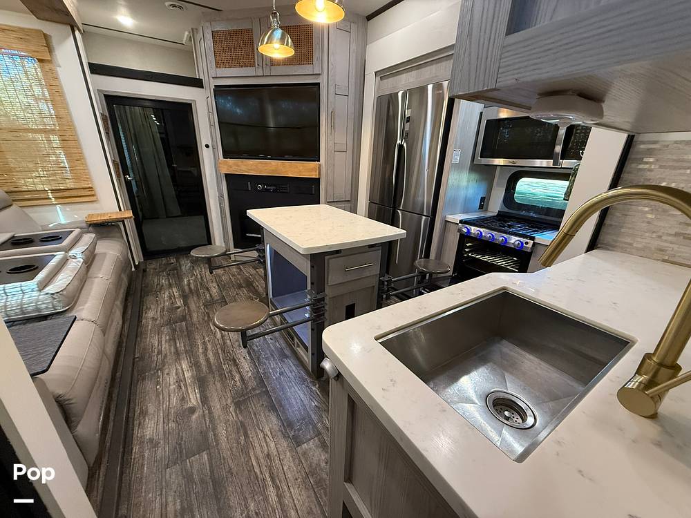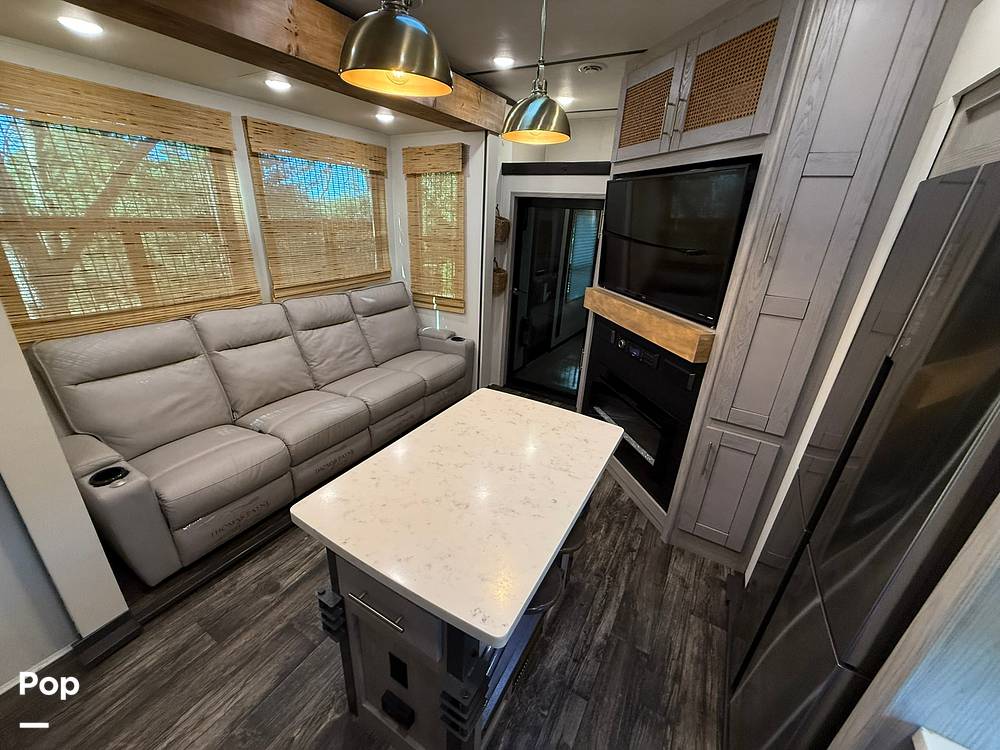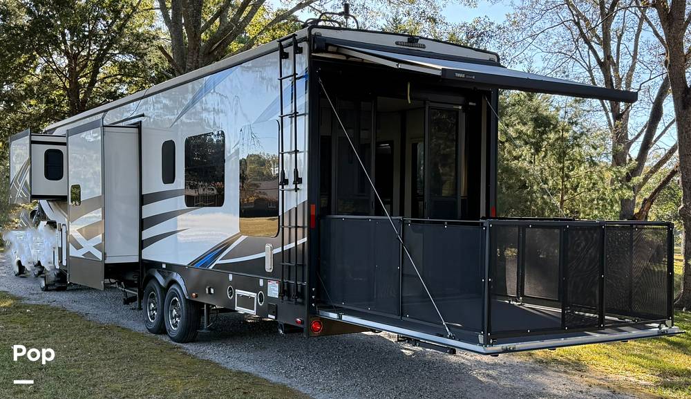 Measuring an impressive 33 feet in length, the Fuzion 373 provides ample room for relaxation and entertainment. Inside, you'll find a well-appointed interior featuring high-quality furnishings and state-of-the-art appliances. The layout includes a master bedroom, a cozy loft, and additional sleeping areas, ensuring everyone has their own space. The kitchen is equipped with modern conveniences, allowing you to prepare meals with ease, while the living area is perfect for unwinding after a day of exploration.