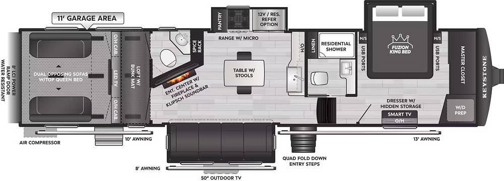 The Keystone Fuzion 373 is not only about comfort but also about performance. With a substantial fuel capacity of 227 liters, this RV is ready to take you on long-distance adventures without frequent refueling stops. Its durable design and reliable engineering ensure a smooth and safe ride, whether you're navigating highways or venturing off the beaten path. Experience the freedom of the open road with the 2021 Keystone Fuzion 373 Fifth Wheel, where every journey becomes a memorable adventure.