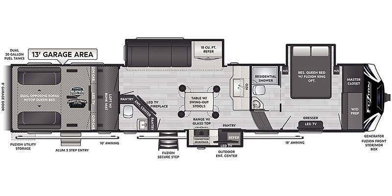 Step inside and you'll find a cozy and inviting interior that feels just like home. The Fuzion 427 is designed with comfort and convenience in mind, featuring a spacious living area, a fully-equipped kitchen, and a stylish bathroom. The kitchen comes with all the essentials you need to whip up delicious meals on the go, while the living area is perfect for relaxing after a day of adventure. Plus, with plenty of storage space, you can bring along all your favorite gear and gadgets.