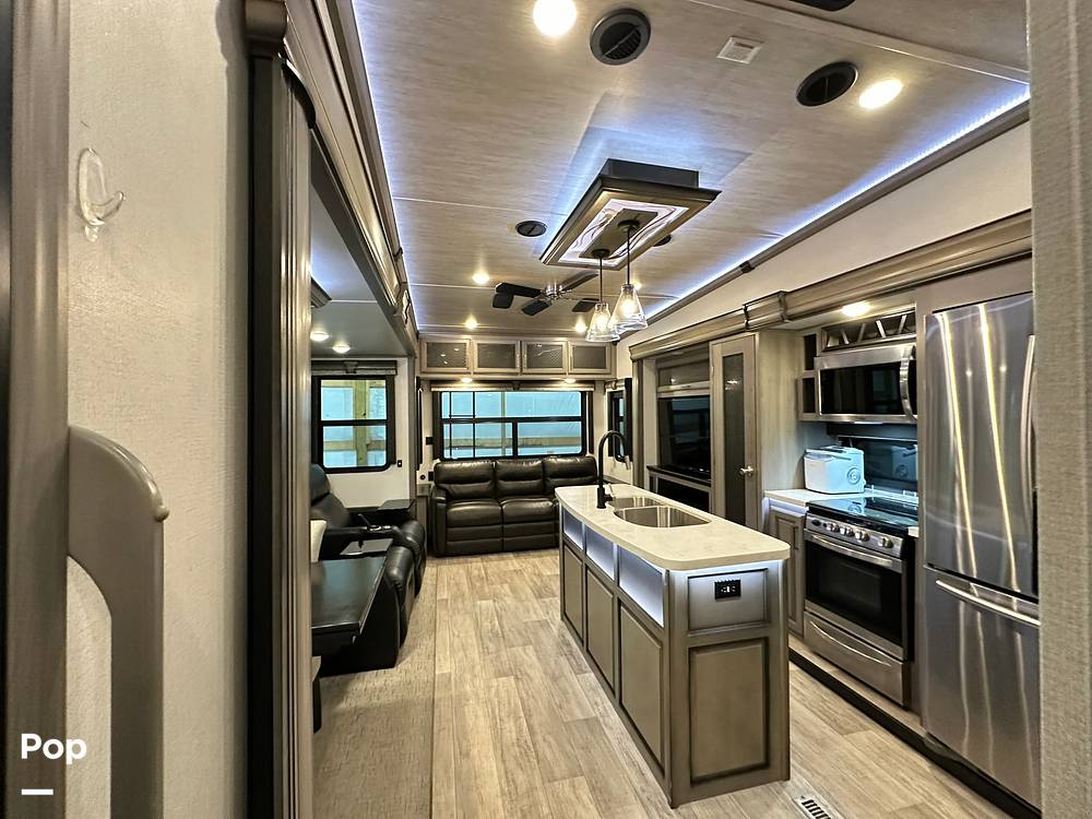 Step inside to find a beautifully designed interior featuring high-quality finishes and thoughtful touches throughout. The Montana 3855BR boasts a well-equipped kitchen with modern appliances, including a large refrigerator, microwave, and stove, making meal preparation a breeze. The cozy living area is perfect for relaxation, complete with plush seating and a state-of-the-art entertainment system. The RV also includes a versatile bonus room that can serve as an office or additional sleeping space, ensuring everyone has their own area to unwind.