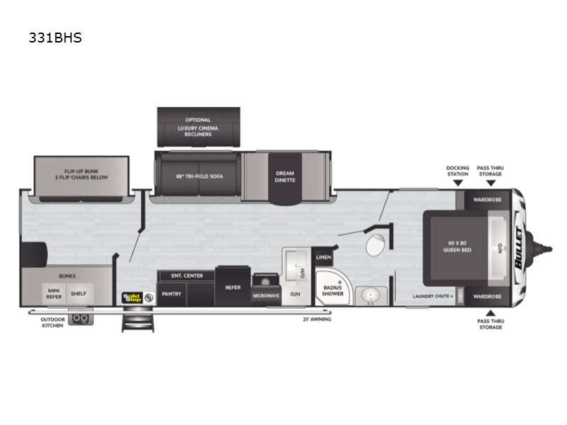 The Keystone Bullet 331BHS is engineered to accommodate up to nine individuals comfortably, making it an ideal choice for family vacations or group excursions. The trailer features two expansive slide-outs, which significantly enhance the living space, providing ample room for relaxation and entertainment. Inside, you will find a well-appointed interior that includes a fully equipped kitchen, a cozy dining area, and a spacious living room. The sleeping arrangements are thoughtfully designed, ensuring a restful night's sleep for all occupants.