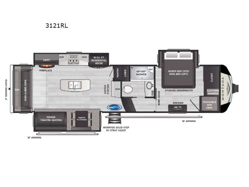 Inside, the Montana 3121RL comfortably sleeps up to four people, making it ideal for families or couples seeking adventure without sacrificing comfort. The thoughtfully designed interior features high-quality furnishings and finishes, creating a warm and inviting atmosphere. The spacious living area is perfect for entertaining or unwinding after a day of exploration, while the fully equipped kitchen allows you to prepare your favorite meals with ease. The luxurious bedroom offers a restful retreat, ensuring a good night's sleep wherever your travels take you.