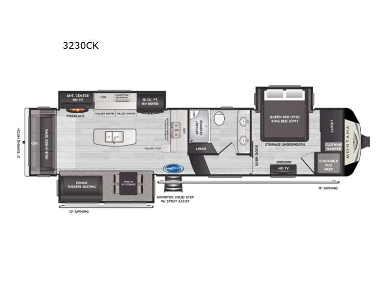 Featuring three slide-outs, the Montana 3230CK provides an expansive living area that can comfortably sleep up to four people. The interior is thoughtfully designed with high-quality finishes and modern amenities, ensuring a cozy and inviting atmosphere. The well-equipped kitchen boasts premium appliances, ample counter space, and plenty of storage, making meal preparation a breeze. The living area is perfect for unwinding after a day of exploration, with plush seating and a state-of-the-art entertainment system.