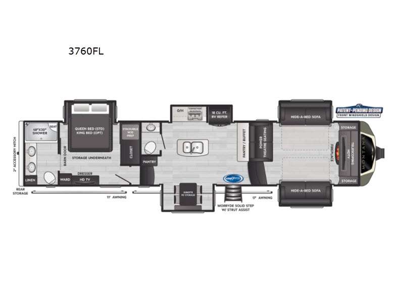 The Montana 3760FL features five slide-outs, significantly enhancing the living space and providing an open, airy feel. Inside, you'll find a thoughtfully designed layout that includes a spacious front living area, complete with plush seating and a large entertainment center. The kitchen is equipped with modern appliances and ample storage, ensuring you have everything you need for gourmet meals on the road. The master bedroom offers a serene retreat with a comfortable bed and additional storage options, while the bathroom provides all the amenities necessary for a comfortable stay.