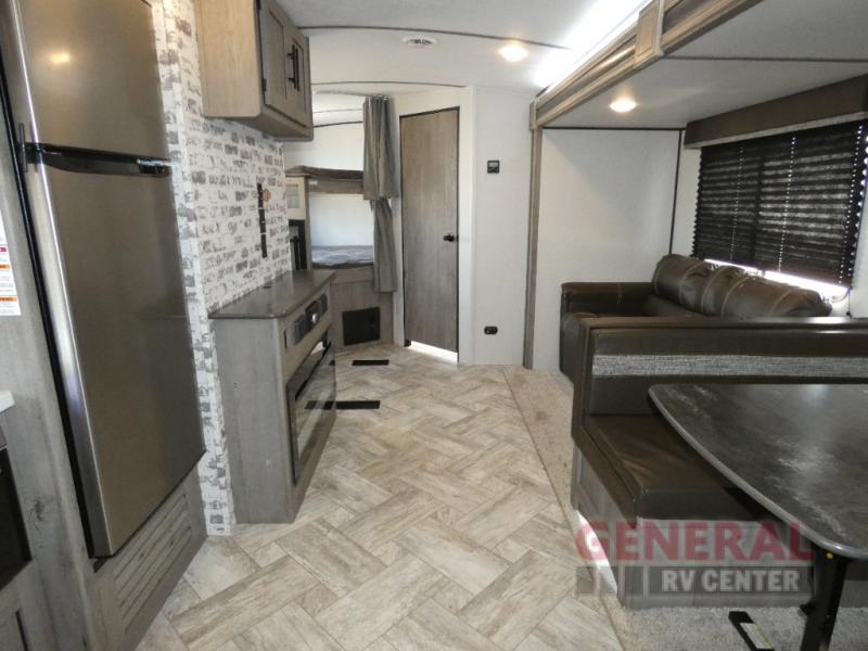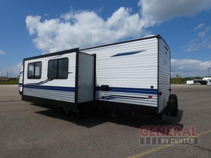 Designed with versatility in mind, this travel trailer can comfortably accommodate up to nine occupants, making it perfect for family vacations or group excursions. The intelligently designed floor plan includes a master bedroom with a queen-sized bed, double bunk beds, a convertible dinette, and a sofa bed, ensuring everyone has a cozy place to rest. The interior is thoughtfully appointed with modern amenities, including a fully equipped kitchen with a refrigerator, microwave, and stove, as well as a well-appointed bathroom with a shower, ensuring all the comforts of home are at your fingertips.