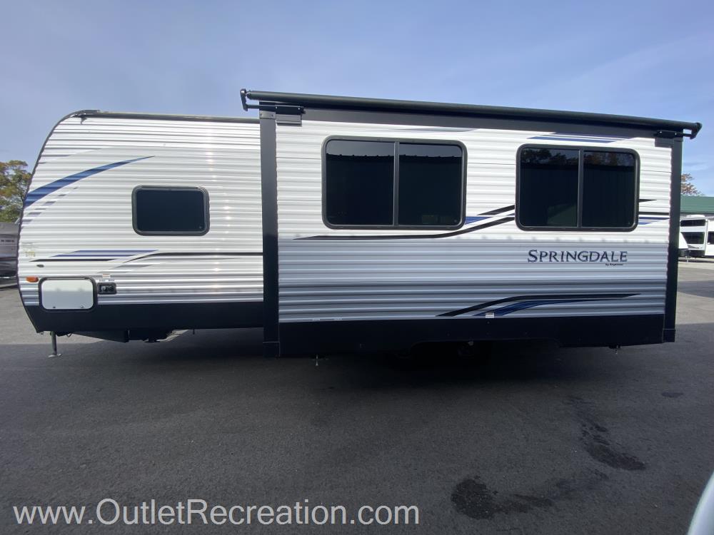 Introducing the 2021 Keystone RV Springdale SC266RL Travel Trailer, a perfect blend of comfort and functionality for your next adventure. This meticulously designed travel trailer offers a spacious and inviting interior, thanks to its single slide-out, which expands the living area to provide ample room for relaxation and entertainment. With a length of 24 feet, this travel trailer is compact enough for easy maneuverability while still offering generous living space.