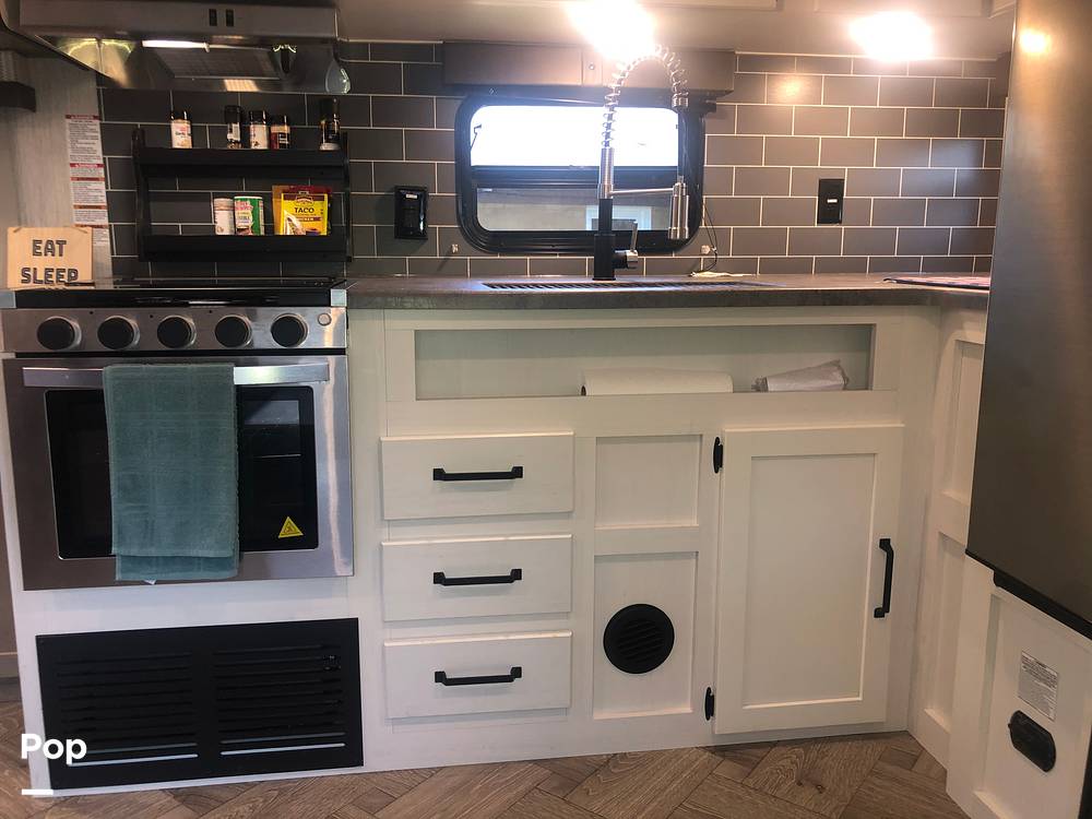 Step inside to find a thoughtfully designed interior that maximizes both functionality and style. The rear kitchen layout is equipped with modern appliances, including a refrigerator, microwave, and oven, making meal preparation a breeze. The cozy living area features a plush sofa and a dinette that easily converts into additional sleeping space. The private master bedroom boasts a comfortable queen-sized bed, ensuring a restful night's sleep after a day of adventure.