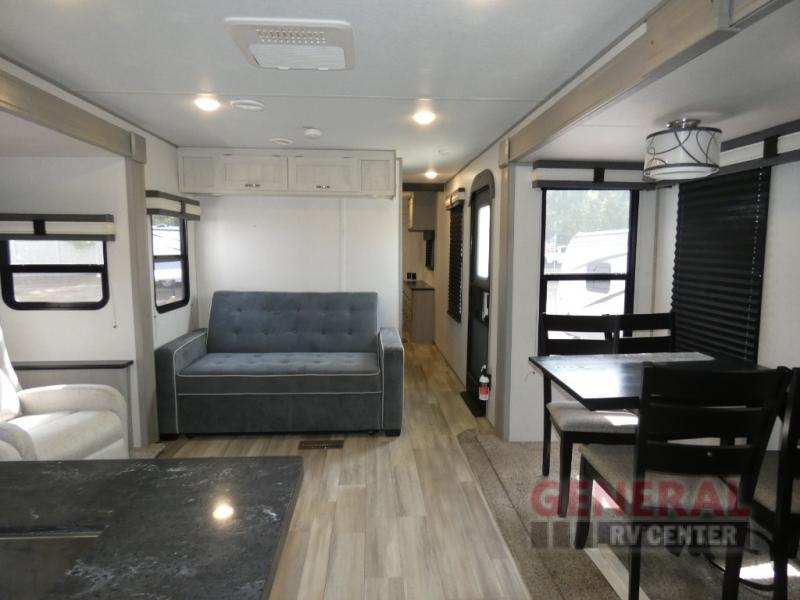 This travel trailer can comfortably sleep up to four people, making it ideal for small families or couples seeking a cozy getaway. The well-appointed interior includes a fully equipped rear kitchen, complete with high-quality appliances and generous counter space, allowing you to prepare meals with ease. The living area is designed for relaxation, featuring plush seating and a stylish entertainment center. The master bedroom offers a tranquil retreat with a comfortable bed and ample storage, ensuring a restful night's sleep.