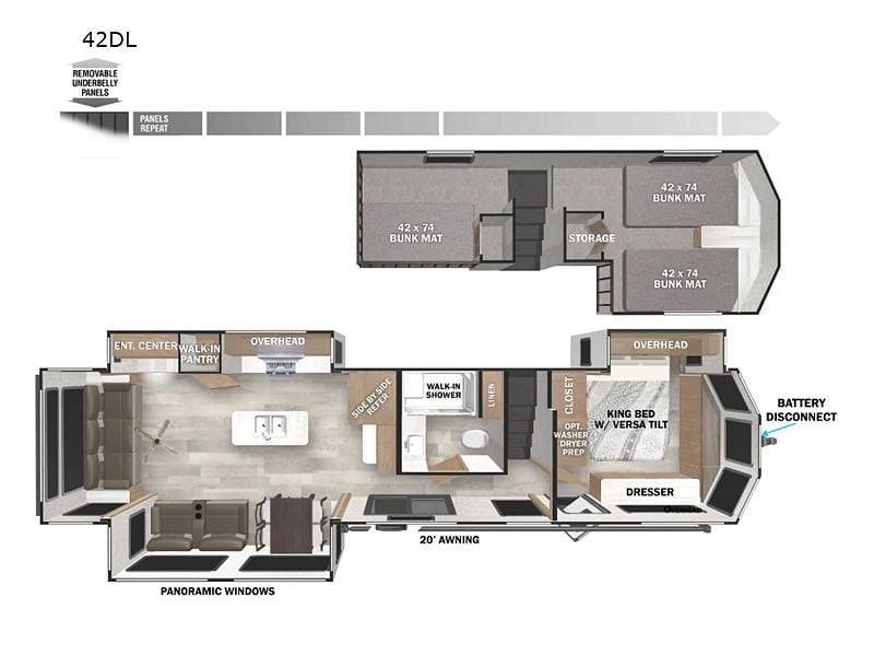 Introducing the 2021 Wildwood Grand Lodge 42DL Travel Trailer, a luxurious and spacious retreat on wheels designed to elevate your travel experiences. With a length of 35 feet, this travel trailer offers ample space and comfort, making it the perfect choice for families or groups seeking adventure without compromising on the comforts of home. Its thoughtfully designed interior can comfortably sleep up to six people, ensuring everyone has their own space to relax and unwind after a day of exploration.