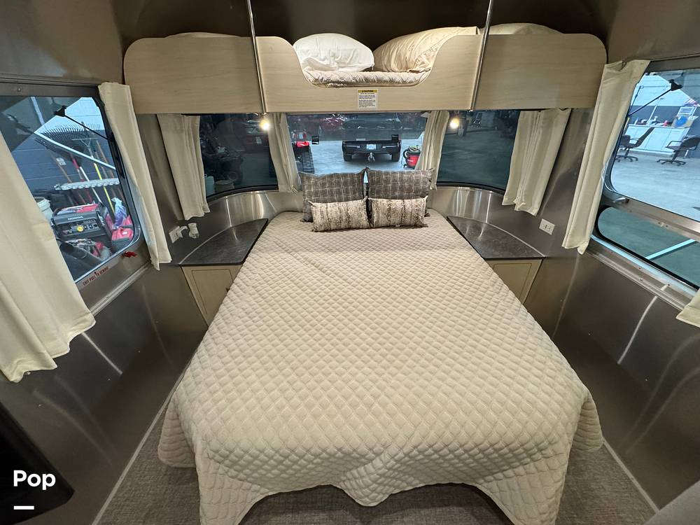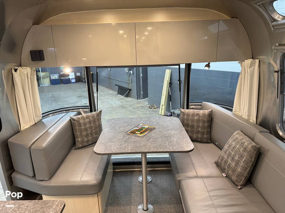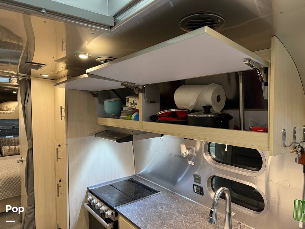 Inside, the Airstream Flying Cloud can comfortably sleep up to five people, making it ideal for family getaways or trips with friends. The interior is thoughtfully designed with a queen-sized bed, a convertible dinette, and a lounge area that transforms into additional sleeping space. The high-quality furnishings and modern amenities ensure a comfortable and enjoyable stay, whether you're parked at a campsite or exploring the open road. The kitchen is equipped with state-of-the-art appliances, including a stove, microwave, and refrigerator, allowing you to prepare meals with ease.