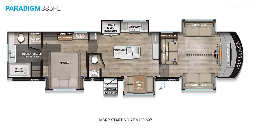 This RV is not just about comfort; it's also about convenience. With thoughtful storage solutions throughout, you can easily pack all your essentials for the journey. The Paradigm 385FL is built with quality and durability in mind, ensuring you have a reliable travel companion for years to come. Whether you're embarking on a cross-country road trip or a weekend getaway, this RV is ready to elevate your travel experience. Don't miss the chance to own this exceptional 2022 Alliance RV Paradigm 385FL Fifth Wheel and make unforgettable memories on the road!
