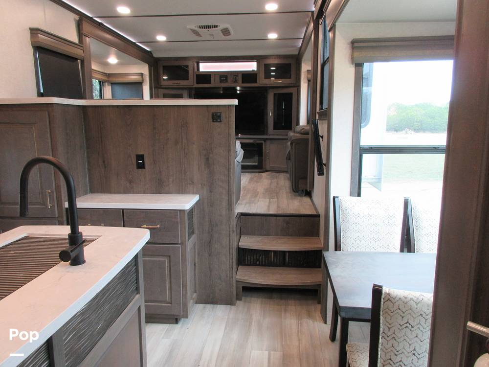 Step inside and be greeted by a beautifully appointed interior that can comfortably sleep up to six people. The Paradigm 385FL features a cozy front living area with plush seating, perfect for relaxing after a day of adventure. The fully equipped kitchen boasts modern appliances and plenty of counter space, making meal preparation a breeze. Enjoy your culinary creations at the elegant dining area, or take the feast outside under the stars.