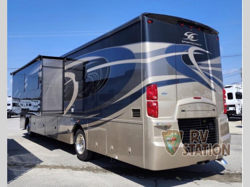 Step inside and you'll find a spacious and stylish interior that makes every journey a pleasure. The Sports Coach 365RB boasts a cozy living area with plush seating and a fully equipped kitchen, including a refrigerator, stove, and microwave. The bathroom is roomy and features a shower, sink, and toilet, ensuring you have all the conveniences you need while on the go. With ample storage throughout, you can bring along all your essentials without feeling cramped.