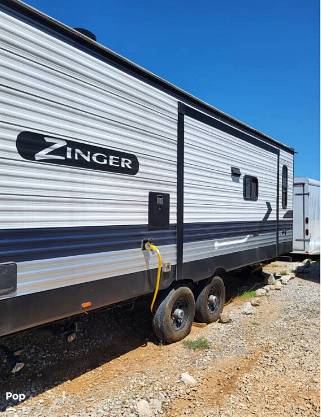 Measuring approximately 32 feet in length, the Zinger 340RE offers ample space for relaxation and entertainment. Inside, you'll find a well-appointed living area featuring plush seating and a modern entertainment center, perfect for unwinding after a day of exploration. The fully equipped kitchen boasts a refrigerator, stove, and microwave, ensuring you have everything you need to prepare delicious meals on the road. The dining area comfortably seats everyone, making it easy to enjoy meals together.