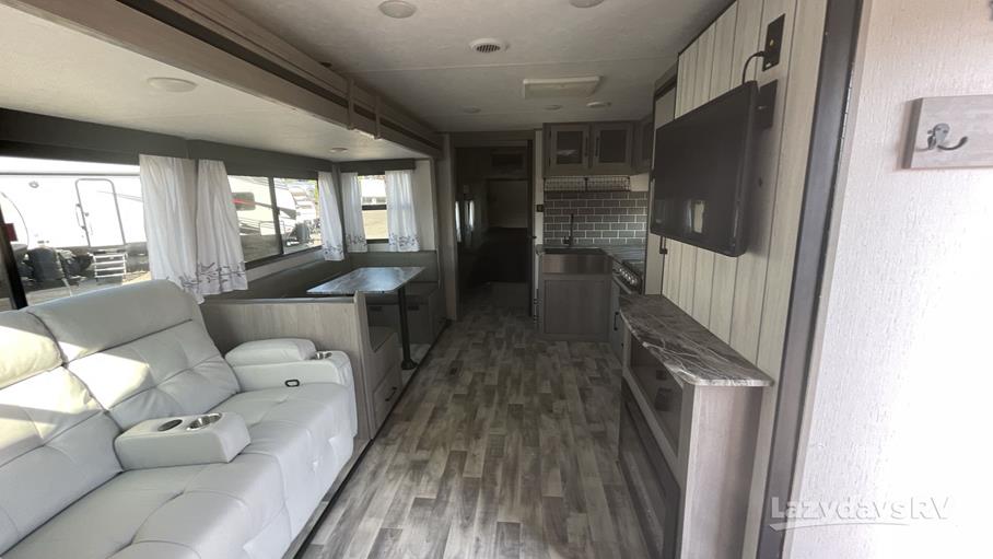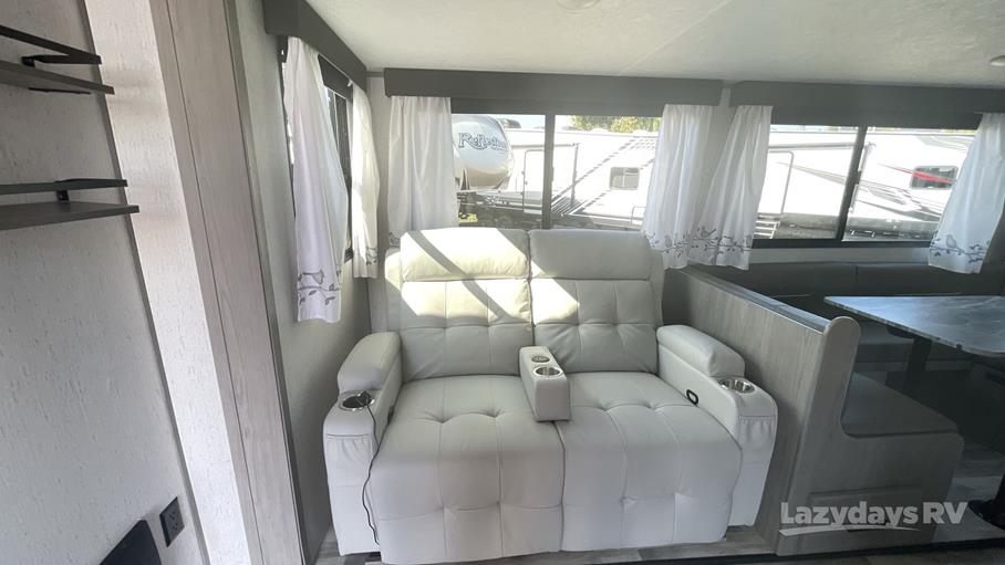 Step inside to find a thoughtfully designed interior that maximizes space and functionality. The single slide-out expands the living area, providing a roomy and inviting atmosphere. The well-equipped kitchen features all the essentials, including a refrigerator, microwave, and stove, making meal prep a breeze. The cozy dining area is perfect for family meals or game nights, while the comfortable seating area invites you to relax and unwind after a day of adventure.
