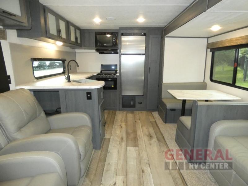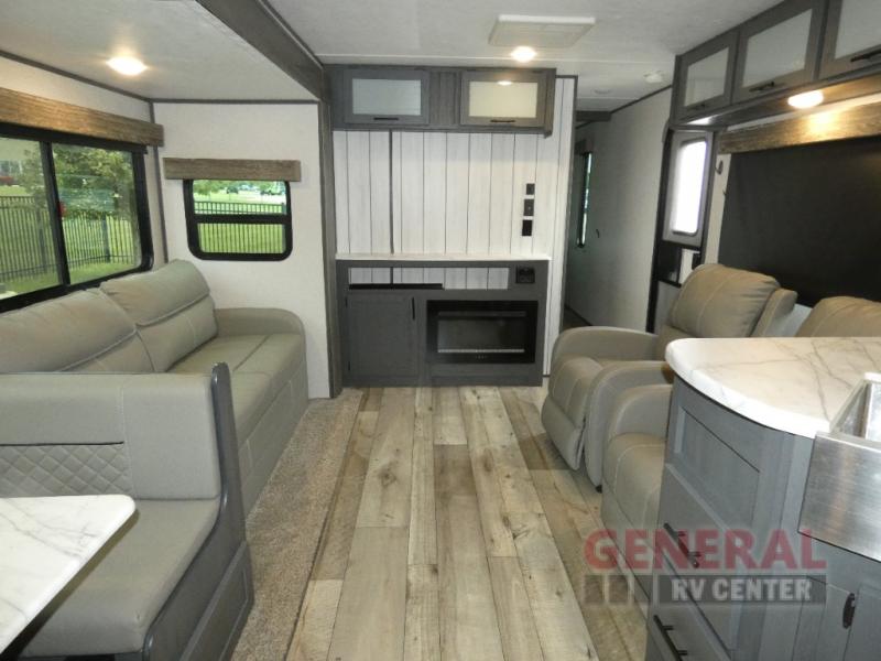 The Aspen Trail 2880RKS is thoughtfully designed to accommodate up to five individuals, ensuring a restful night's sleep after a day of exploration. The intelligently laid-out interior includes a spacious rear kitchen, equipped with modern appliances and ample storage, allowing for convenient meal preparation on the go. The living area is designed for relaxation, featuring comfortable seating and a well-appointed entertainment center, perfect for unwinding after a day of adventure.