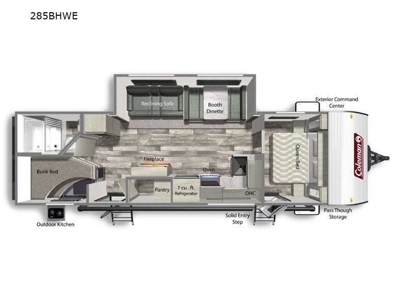 The Coleman Lantern Series 285BHWE features a single slide-out that expands the living area, providing a spacious environment for up to eight occupants. The intelligently designed floor plan includes a cozy sleeping arrangement, accommodating everyone comfortably. Whether you're planning a weekend getaway or an extended road trip, this travel trailer ensures a restful night's sleep for all. The interior is thoughtfully equipped with modern amenities, including a fully functional kitchen, a dining area, and a well-appointed bathroom, making it a true home away from home.